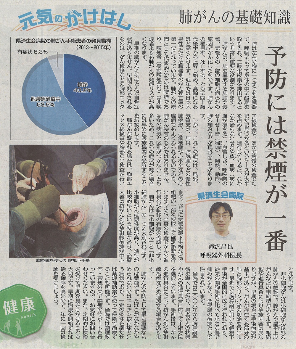 内容:医療解説企画「元気のかけはし」のコーナーで、呼吸器外科医長の滝沢昌也医師が「肺がんの基礎知識」をテーマに寄稿しました。