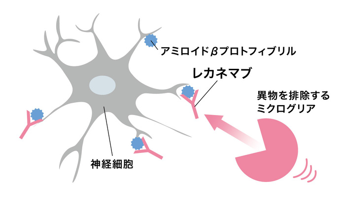 レカネマブは2023年12月に承認、発売された「アルツハイマー病による軽度認知障害(MCI)」と「アルツハイマー病による軽度の認知症」に対する新しい薬です。アミロイドβがかたまりになる途中のアミロイドβプロトフィブリルに引っ付くことで、異物を排除するミクログリアを引き寄せ、アミロイドβを取り除くことができます。