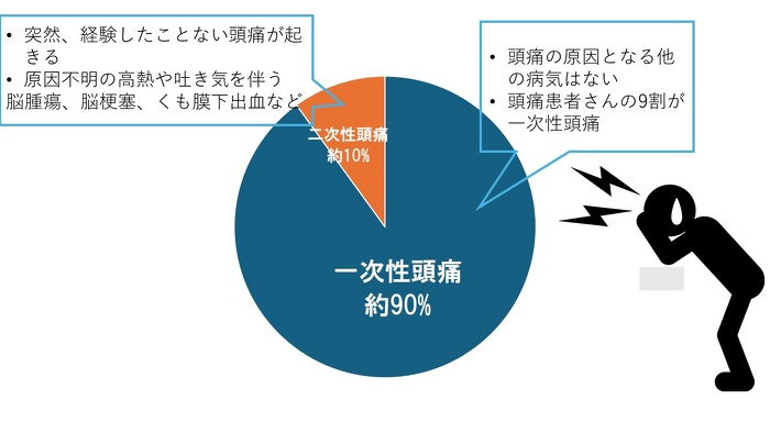 頭痛と聞くと、片頭痛や風邪の症状としての頭痛、肩こりからくる頭痛など、いろいろ思い浮かべることができると思います。 頭痛の種類は大きく2つに分類できます。