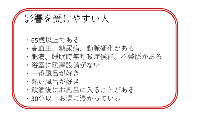 下記のチェックリストに該当する場合は、ヒートショックの対策をして入浴するようにしましょう。