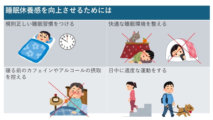 ただ睡眠をとるだけでなく睡眠環境、生活習慣、嗜好品の摂り方などを見直し、可能な範囲で改善するとともに、慢性疾患の早期発見・早期治療に努め、睡眠休養感を高められるよう努めることが大切です。