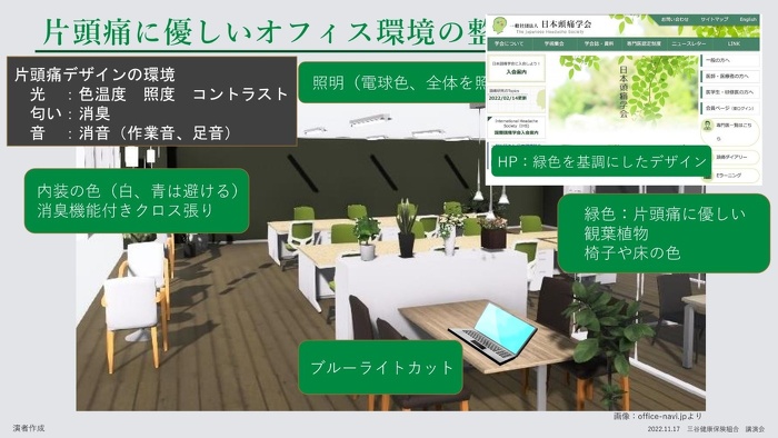 • 職場での配慮 片頭痛の誘発因子となりうる光、音、匂いなどへの配慮が有効な場合があります。例えば、片頭痛に優しいオフィス環境として、内装の色(白、青は避ける、緑色を基調とする)、照明の色温度や照度、ブルーライトカット、消臭機能付きクロス、音対策(消音)などが提案されています。