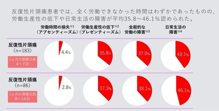 反復性片頭痛患者を対象とした調査では、労働できなかった時間はわずかでしたが、労働生産性の低下(プレゼンティーズム)や日常生活の障害が平均35.8%〜46.1%認められています。これは、片頭痛が健康を害する要因の一つであり、健全な企業経営(健康経営)を考える上でも重要な課題であることを示しています。プレゼンティーズムによる潜在的な経済的損失は、日本だけでも年間3600億円から2兆3000億円にのぼるという試算もあります。片頭痛全体による日本経済の損失は年間2,880億円とも推定されています。