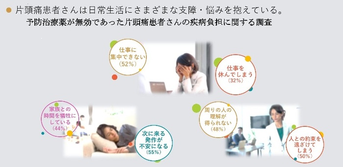 片頭痛患者さんは、以下のような様々な支障や悩みを抱えているという調査結果があります。