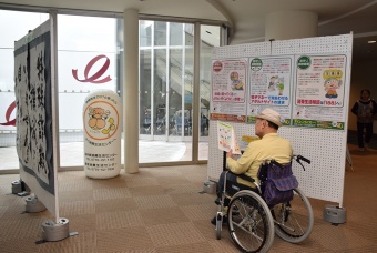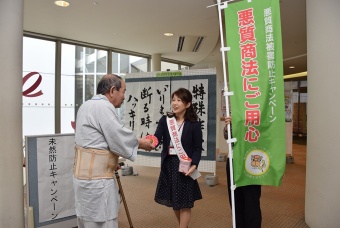 2017年9月28日(木)~10月4日(水)の期間、高齢者の消費者被害未然防止キャンペーンの一環で啓発の展示を行っています。悪質商法や架空請求などの特殊詐欺といった消費者トラブルへの注意喚起のパネルや、羽水高校書道部などによる啓発メッセージの揮毫作品を展示しています。