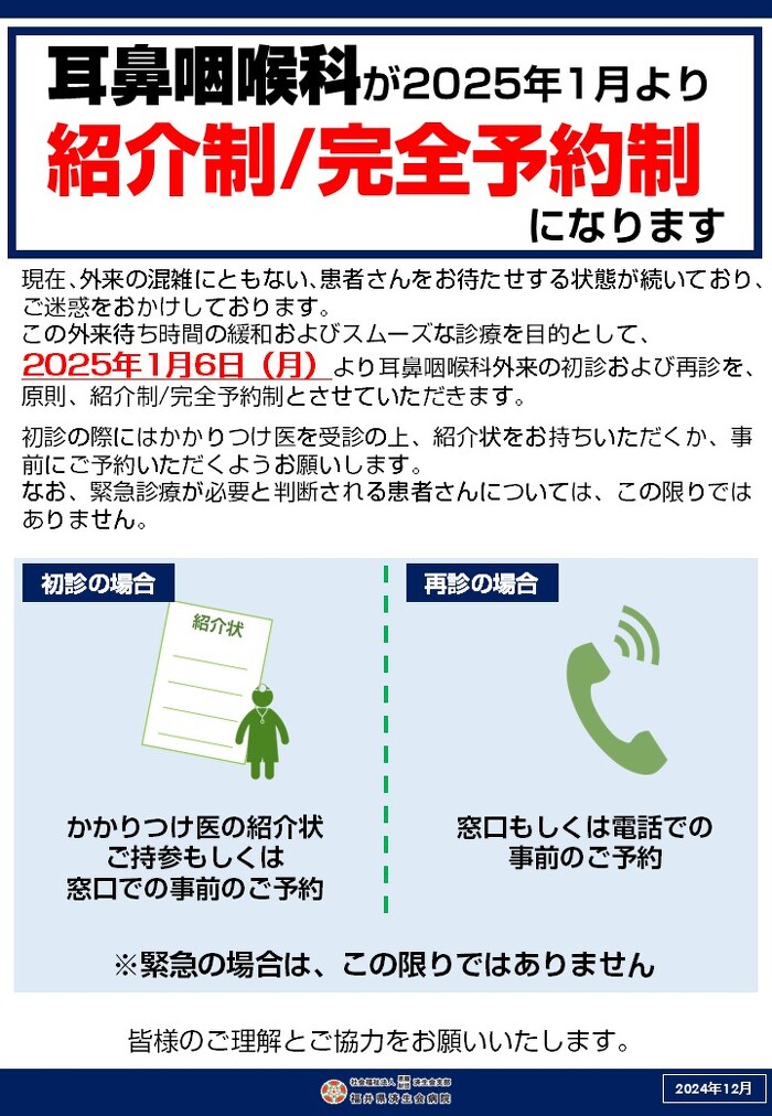 耳鼻咽喉科が2025年1月より紹介制/完全予約制になります