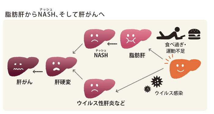 放置すると肝臓が炎症を起こし肝炎になり、肝臓が硬くなる肝硬変、そして肝がんへと進行する可能性があります。脂肪肝から少しずつ進行する肝臓病のことを「非アルコール性脂肪肝炎(NASH)」といいます。お酒を飲まない人が発症する肝炎のひとつと言った方がいいかもしれません。