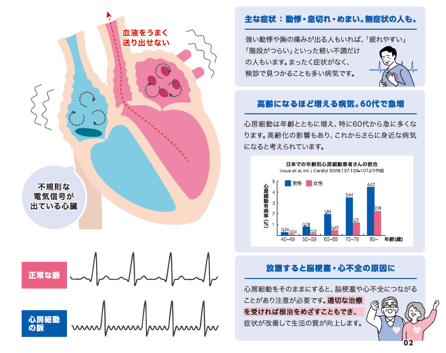 動悸や息切れ、胸の圧迫感など、日常生活の中で突然あらわれる不安な症状。その原因として近年増えているのが「心房細動」という不整脈です。心臓の電気の流れが乱れることで心房が小刻みに震え、脈が不規則になります。特に60代以降に多く、日本でも高齢化に伴って患者数が増えています。放置すると脳梗塞の危険性があり、早期発見と適切な治療が重要です。