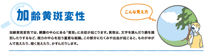 加齢黄斑変性が進むと、視野の中心が見えにくくなり、文字を読む、顔を識別するなど、細かい作業が難しくなります。