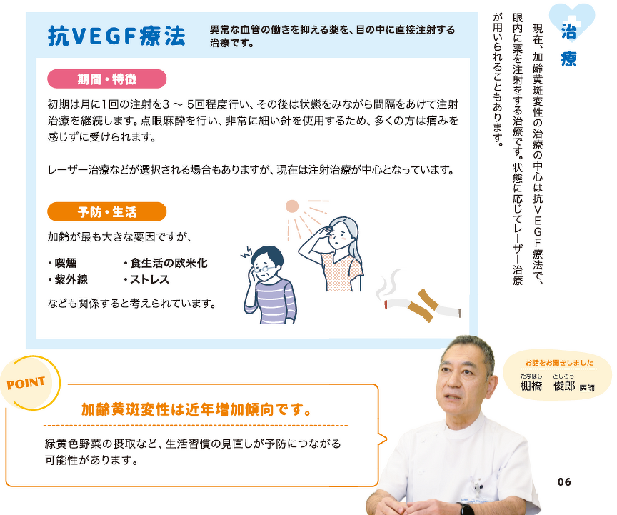 現在、加齢黄斑変性の治療の中心は抗VEGF療法で、眼内に薬を注射する治療です。状態に応じてレーザー治療が用いられることもあります。