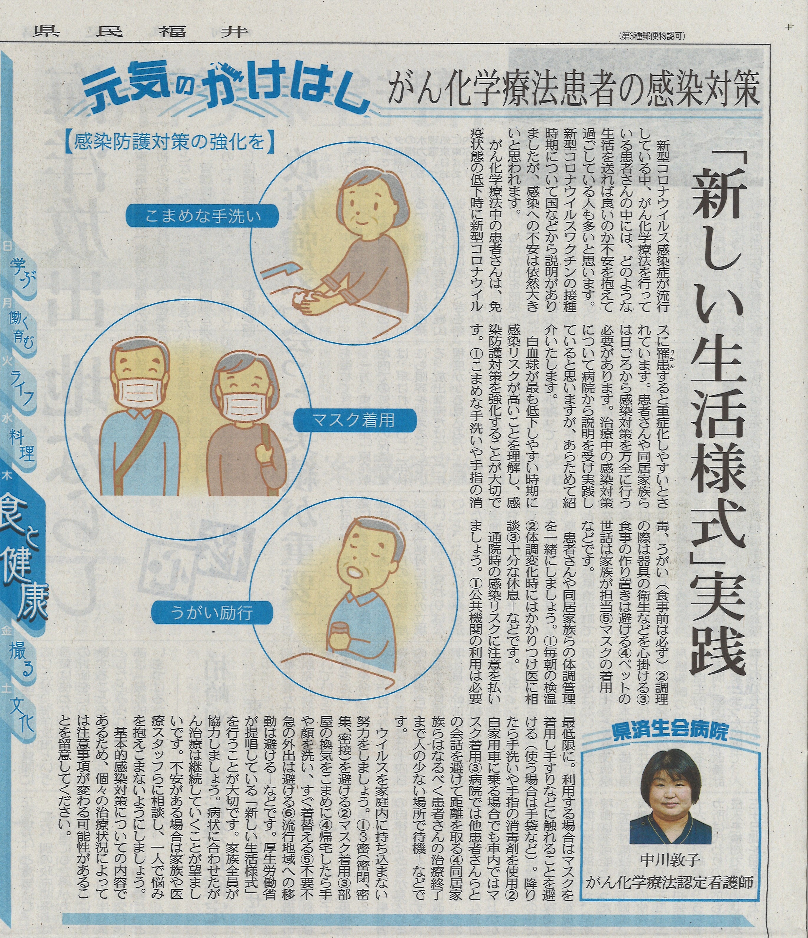 内容:「元気のかけはし」のコーナーで、中川敦子がん化学療法認定看護師が「がん化学療法患者の感染対策」をテーマに寄稿しました。