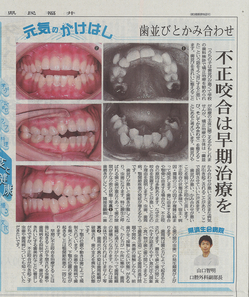 掲載日:2021年8月19日(木) 掲載誌:日刊県民福井 内容:「元気のかけはし」のコーナーで山口智明口腔外科副部長が「歯並びと噛み合わせ」をテーマに寄稿しました。