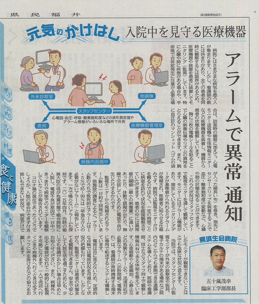 掲載日:2021年8月26日(木) 掲載誌:日刊県民福井 内容:「元気のかけはし」のコーナーで五十嵐山茂幸臨床工学部部長が「入院中を見守る医療機器」をテーマに寄稿しました。
