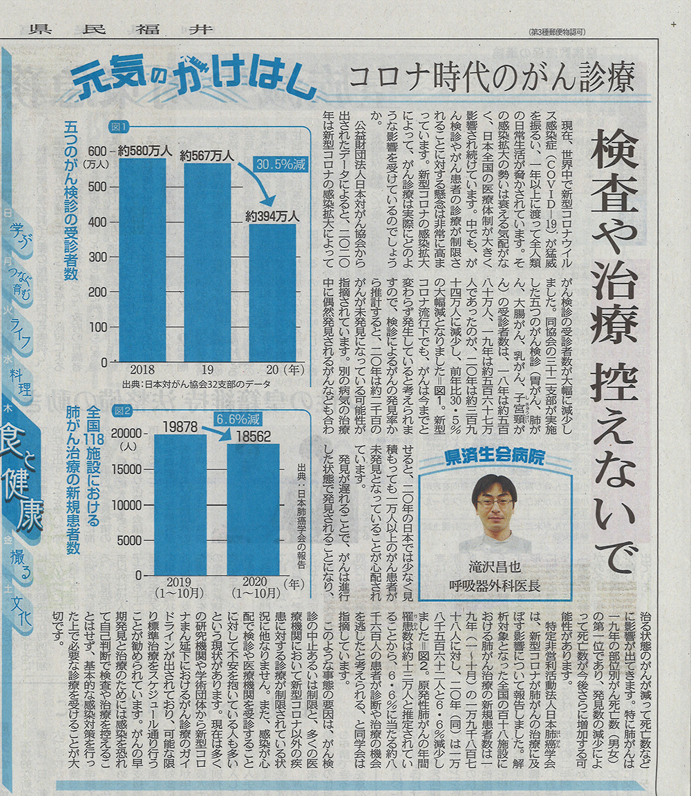 掲載日:2021年9月2日(木) 掲載誌:日刊県民福井 内容:「元気のかけはし」のコーナーで呼吸器外科滝沢昌也医長が「コロナ時代のがん診療」をテーマに寄稿しました。