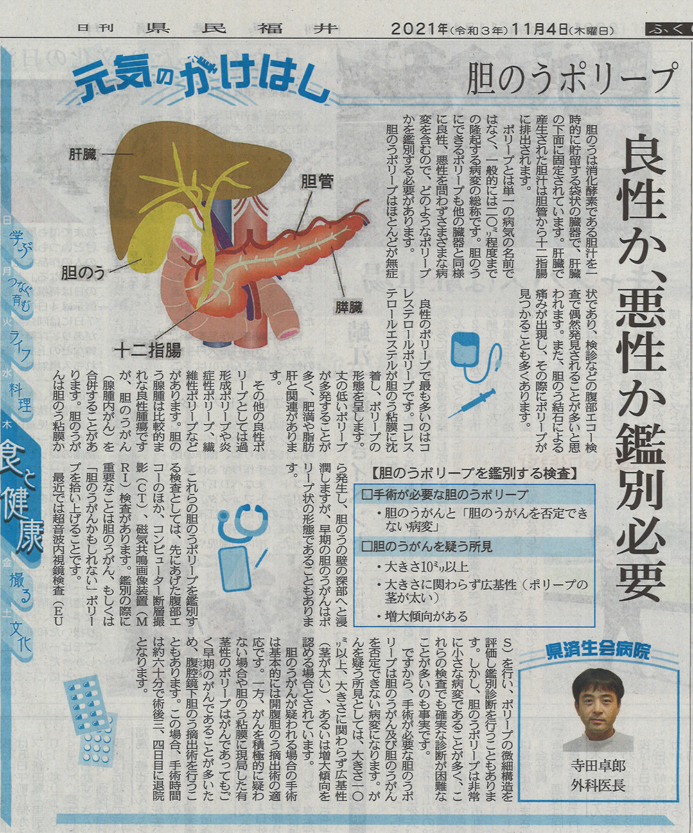 掲載日:2021年11月4日(木) 掲載紙:日刊県民福井 内容:「元気のかけはし」のコーナーで外科の寺田卓郎医長が「胆のうポリープ」をテーマに寄稿しました。