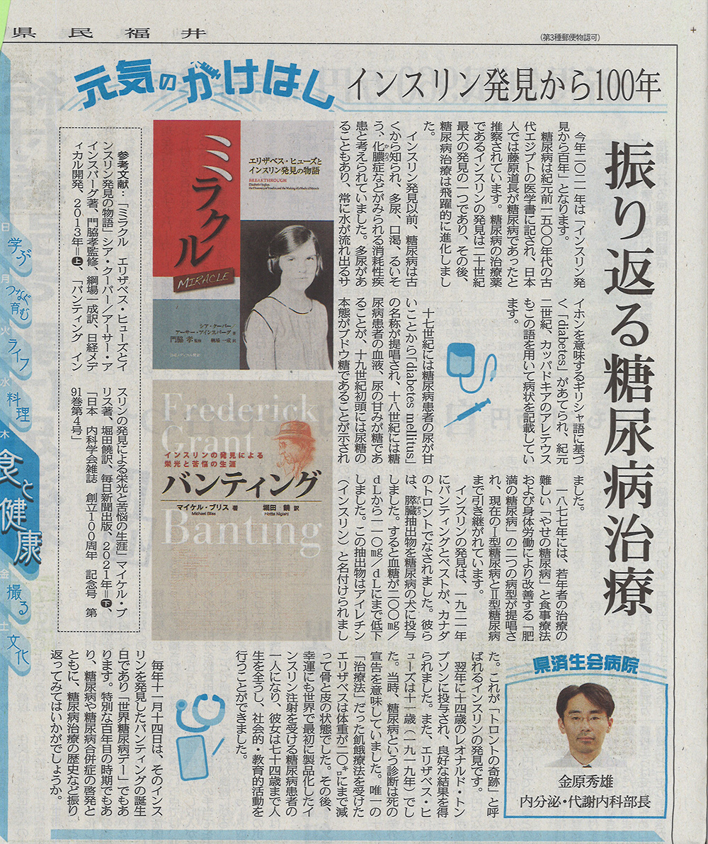 掲載日:2021年11月11日(木) 掲載紙:日刊県民福井 内容:「元気のかけはし」のコーナーで内分泌・代謝内科の金原秀雄部長が「インスリン発見100年」をテーマに寄稿しました。
