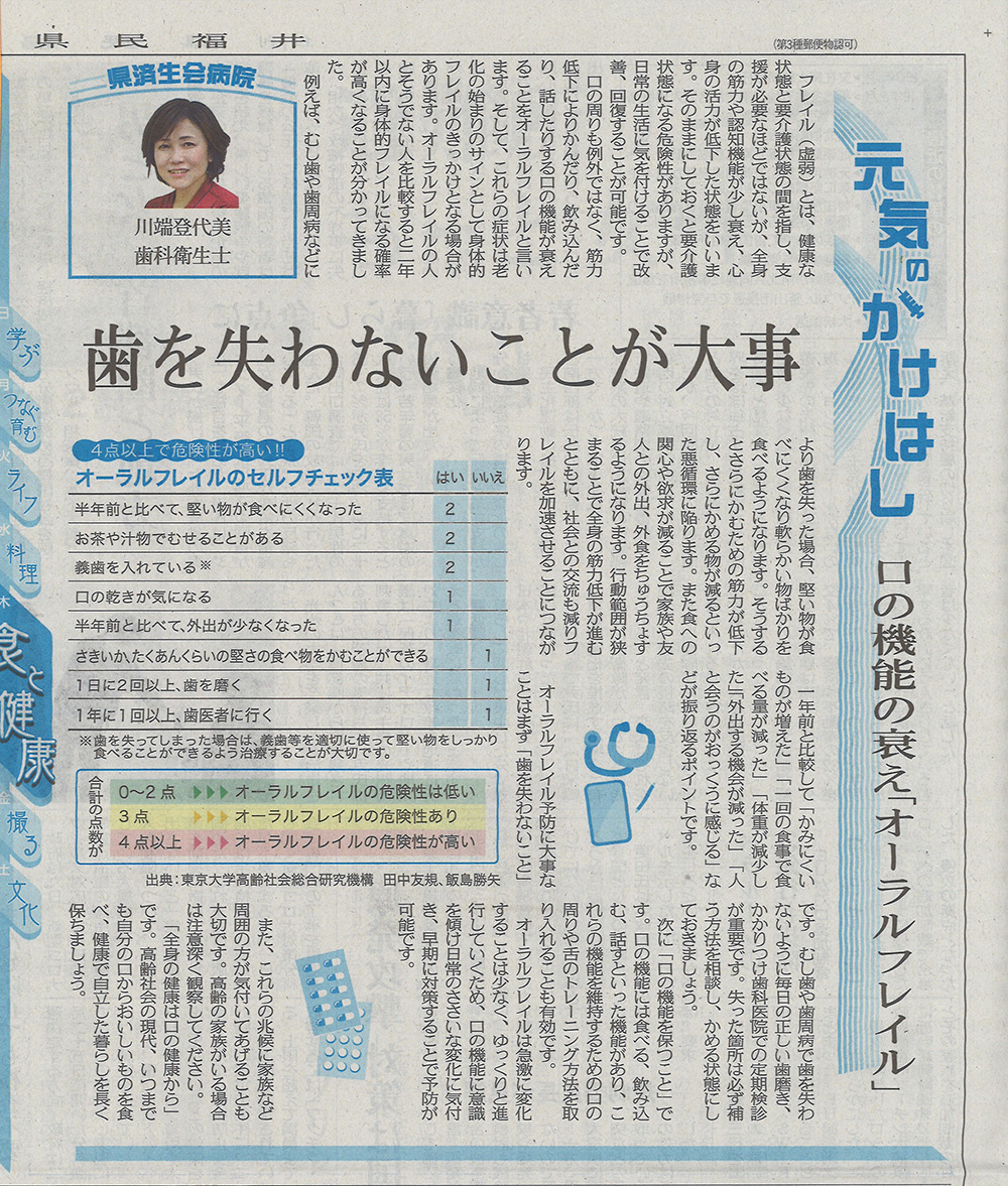 掲載日:2022年3月10日(木) 掲載紙:日刊県民福井 内容:「元気のかけはし」のコーナーで川端登代美 歯科衛生士が「オーラルフレイル」をテーマに寄稿しました。