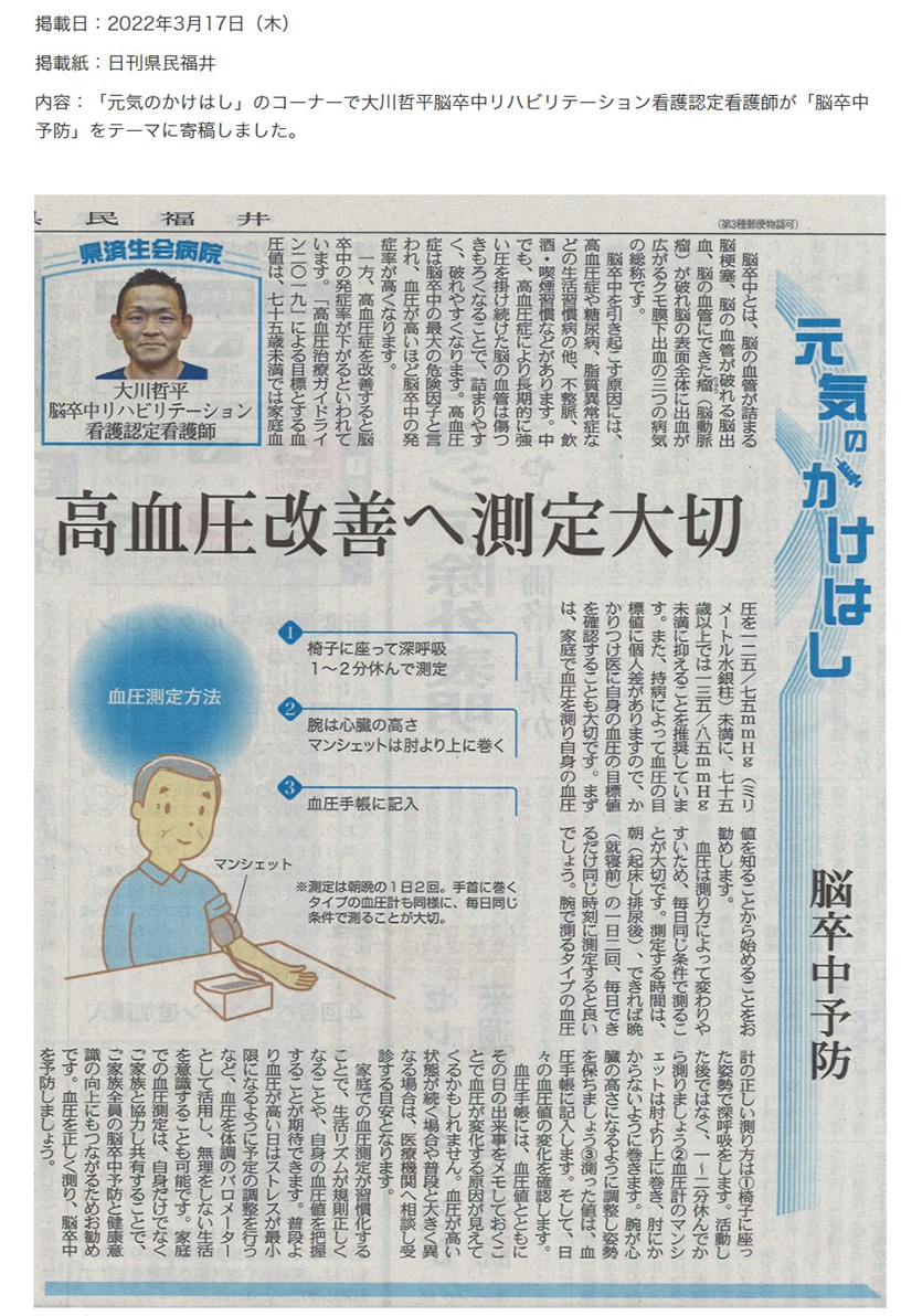 掲載日:2022年3月17日(木) 掲載紙:日刊県民福井 内容:「元気のかけはし」のコーナーで大川哲平脳卒中リハビリテーション看護認定看護師が「脳卒中予防」をテーマに寄稿しました。