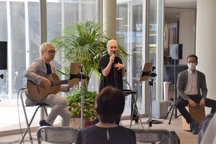 内 容:6月17日に行われた「ボランティアコンサート」について紹介されました。乳がん治療を続けながら全国でライブ活動を行う歌手のKEIKOさんとギタリストのKOUJIさんがデュエットを披露し、患者さんや職員ら約60人が演奏に耳を傾けました。KEIKOさんは「病気になり痛みを知ってから見栄も欲もプライドもなくなった。歌うことでお客さんから元気をもらっている。」とコメントしました。
