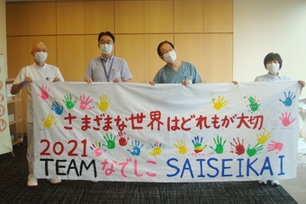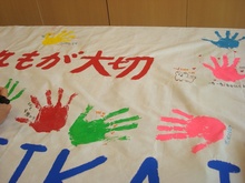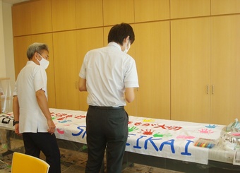 毎年恒例のリレーフォーライフのフラッグ作りも始まり、思い思いに手形を押したりメッセージを書いたり。中央に書かれた「みんなさまざま」の言葉がぴったりです。みなさんの思いがつまったフラッグ作りは、次回の9月3日のメディカルカフェの時間にも続けておこないます。ぜひご参加ください。