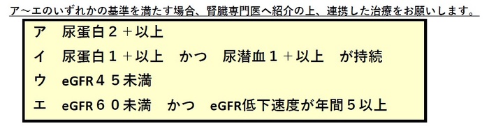 下図の黄色~赤色に該当するかた、緑のゾーンであっても急峻にGFRが低下されている方は腎臓専門外来への紹介受診を推奨しております。