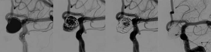 2) 動脈瘤内大きさに応じたプラチナ製のコイルで塞栓(このときにコイルが母血管にはみださないようにバルーン(風船)やステントを使用することがあります)