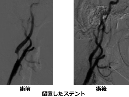 頸部内頸動脈起始部に高度狭窄があると、これにより脳梗塞が生じる恐れがあります。薬物治療が第1選択ですが、狭窄が高度であったりプラークが不安定であったりする場合には、治療に対する危険性を考慮しても、血管拡張術を行った方が脳梗塞発症率が少ないと考えられます。