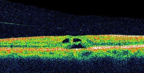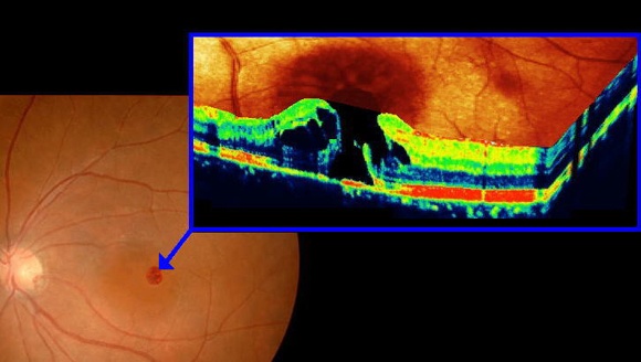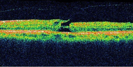 黄斑部が更に引っ張られて、一部が破れて弁のようになった状態です。視力が低下し、物が歪んで見えます。