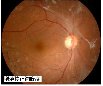 眼底に白い染みの様な物が現れたり、網膜の血管が拡張したりします。