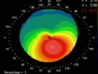 円錐角膜とは角膜の中央部分の厚みが薄くなり、角膜が前方へ円錐状に突出する病気です。角膜が歪むことよって乱視が生じるため視力が低下します。思春期に発症し、徐々に進行し30歳を過ぎると進行が停止するとされています。個人差があり、30歳を超えても進行することもあります。原因は不明です。診察にて角膜の突出所見がみられ、また角膜解析検査などで、角膜中央部やや下方の角膜のカーブがきつくなり、非対称性の乱視が一定の基準以上あれば円錐角膜と診断されます。軽度な円錐角膜であれば、眼鏡やソフトコンタクトレンズの装用で視力が得られますが、進行するとハードコンタクトレンズや円錐角膜用の特殊なハードコンタクトレンズが必要になります。突出の程度が高度の場合、角膜の中央部が薄くなってしまい角膜移植が適応になります。当院ではアイバンクと連携して角膜移植も行っております。