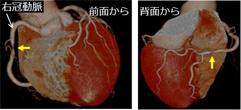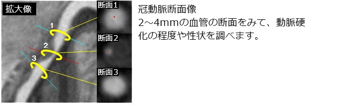 当院には一昨年に最新鋭64列マルチスライスCTが導入されました。これにより比較的短時間で超高解像度の冠動脈の画像が得られるようになり、冠動脈病変のより正確な解析ができるようになりました。さらにこのCT画像をもとに、冠動脈病変の組織学的な性状を推測することにより、狭心症の治療に役立たせることができます。また本年から一段とパワーアップした解析ソフトを使用できるようになり、緊急の場合でも正確な評価を行えるようになりました。