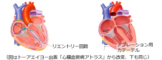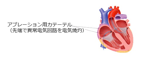“正常刺激伝導路”と呼ばれる正常な電気回路以外に、異常な電気回路が存在するために発生する不整脈です。その異常な電気回路は、ほとんどの場合弁輪部という部分の近傍に存在するために、他の不整脈に比べ不整脈の発生源の正確な部位が比較的容易に特定できます。また最も古くから行われているアブレーションであるために、手技も確立され成功率は非常に高くアブレーション後の再発率も数%未満であるため、この不整脈のアブレーションの治療成績が最も高くなっています。
