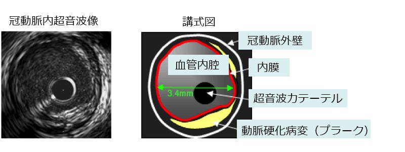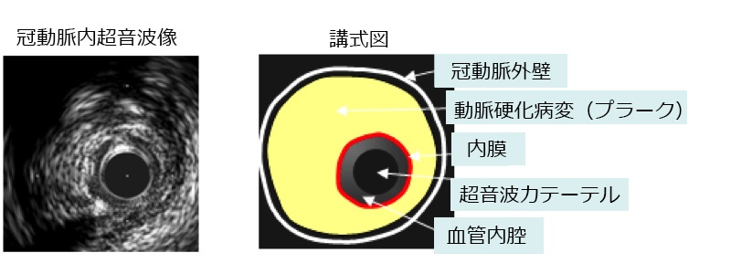 冠動脈内に超音波カテーテルを入れて、冠動脈の断面像を観察します。血管の大きさ、血管内腔の大きさ、動脈硬化病変の大きさや性状を調べます。当院では、経皮的冠動脈形成術を行うほぼ全例で冠動脈内超音波を用いて病変の特徴を確認し、病変ごとに最適な治療を行うようにしています。
