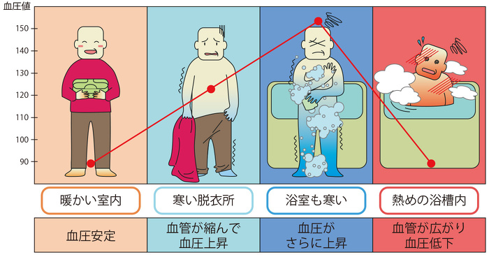 ヒートショックを予防するポイントは、血圧が乱高下しないようにすることです。温度差をなるべくなくし、体に負担のない入浴方法を心掛けましょう。