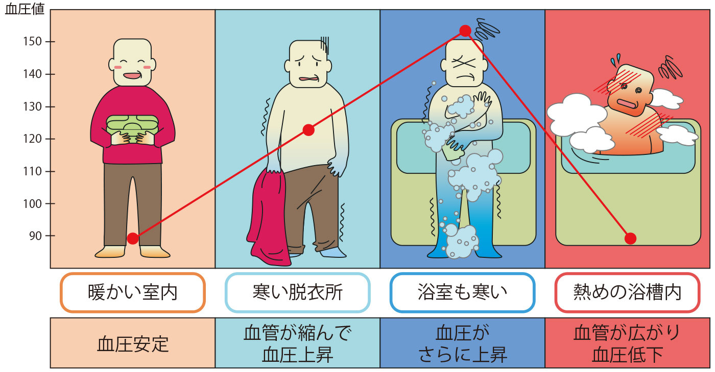 人の体は、寒さを感じると体温を保つために欠陥を収縮させます。暖かいリビングから冷え込んだ脱衣所や浴室へ移動すると、皮膚の血管が急激に縮み、その結果、血圧は一気に上昇します。この時点ですでに心臓や血管に大きな負担がかかり脳出血や心筋梗塞を発症したります。その直後、浴槽に入り体が温まってくると血管が広がり、急上昇した血圧が急下降します。この急激な血圧の低下により、一時的に脳内に血液が回らない貧血の状態となり一過性の意識障害を起こす可能性があります。浴槽内での意識障害が、溺れて死亡する事故の原因の一つとして考えられています。また、トイレでヒートショックを起こす人もいるため、お風呂以外でも温度変化のある場所には要注意です。