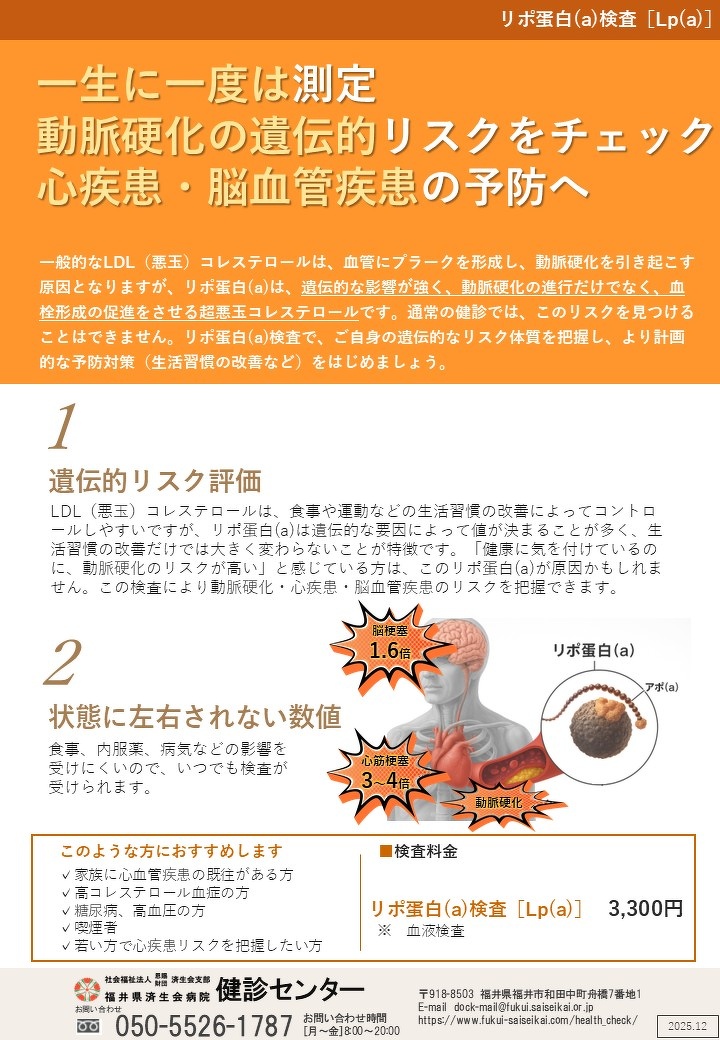2026年4月1日(水)より Lp(a) 検査を開始します。健診当日の追加も可能ですが、事前予約がスムーズです。