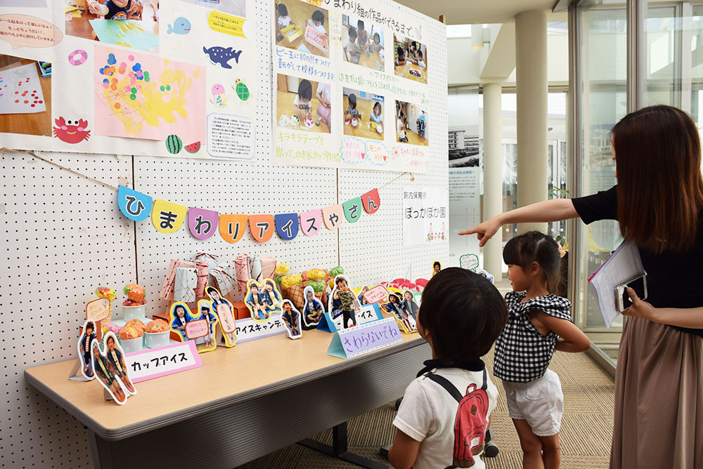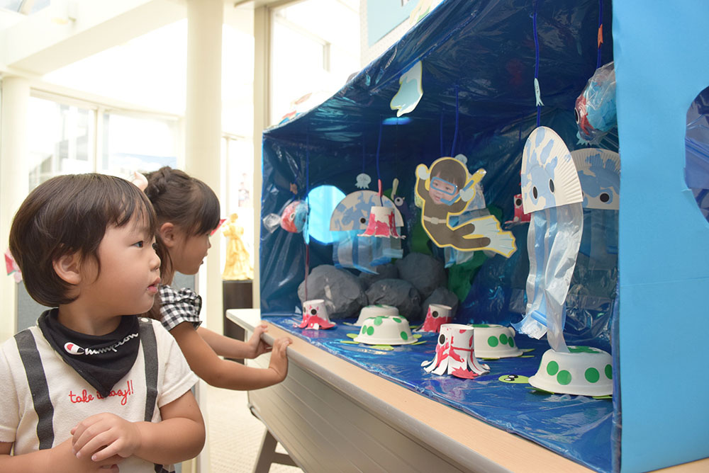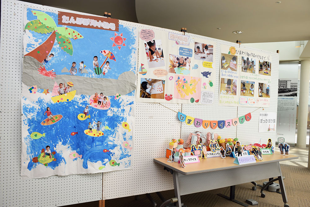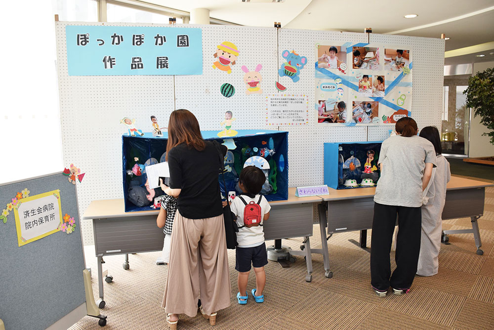 2018年7月26日(木)から8月3日(金)の期間中、当院院内保育所「ぽっかぽか園」の園児が制作した作り物の作品展を開催しています。海や夏祭りをテーマにした可愛らしい作品が並んでいますので、ご来院の際にぜひお立ち寄りください。