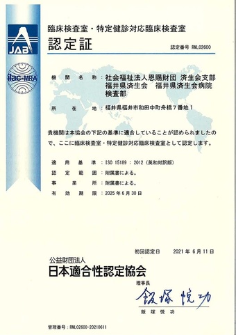 認定の取得により、当院の検査部が正確な検査結果を出すためのプロセス、技術・能力が国際基準を満たしていることを認められたことになります。