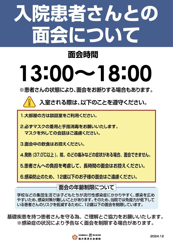 6.感染防止のため、12歳以下のお子様の面会はご遠慮ください。 ****************************************************