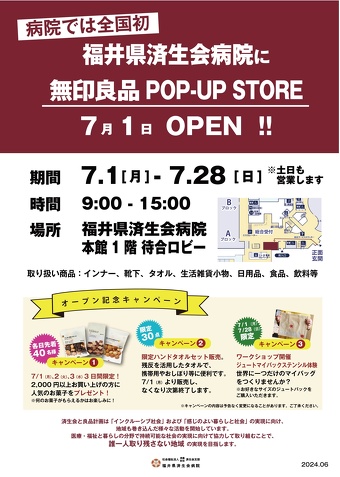 2024年7月1日(月)株式会社良品計画と福井県済生会は、患者さんやその家族、地域の方々のための買い物利便性を向上させる特別なPOP-UP STORE「無印良品 福井県済生会病院」をオープンします。