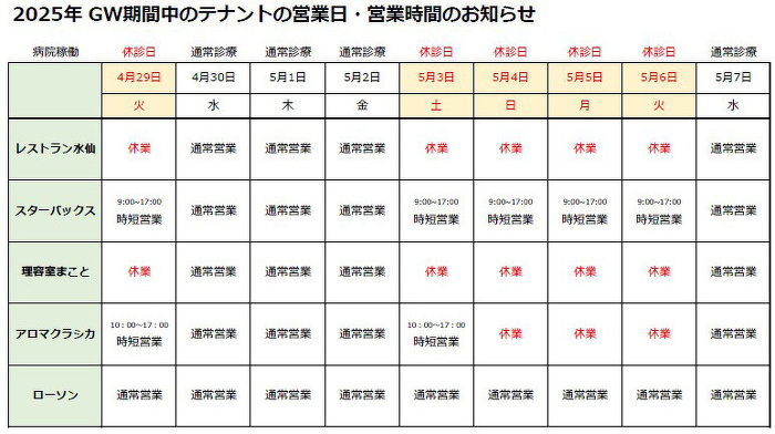 2025年ゴールデンウィーク期間中、院内テナントの営業は、以下の通りとなっております。