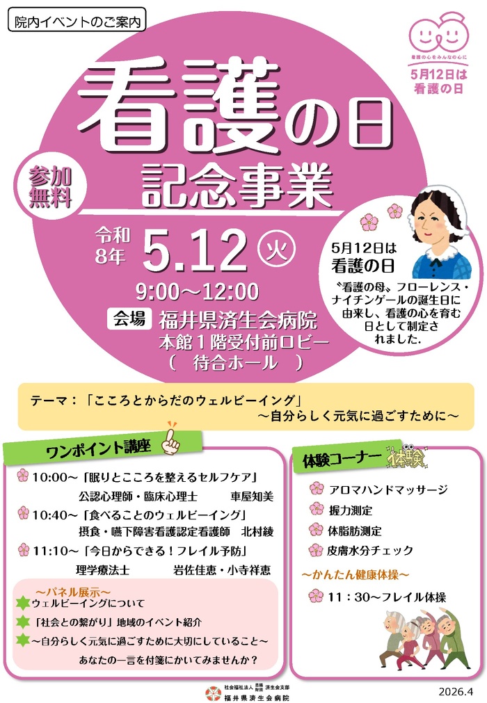毎年5月12日は、フローレンス・ナイチンゲールの誕生日にちなんで制定された「看護の日※」です。当院では1997年から、看護や健康を身近に感じていただこうと、看護の日に記念事業を行っております。