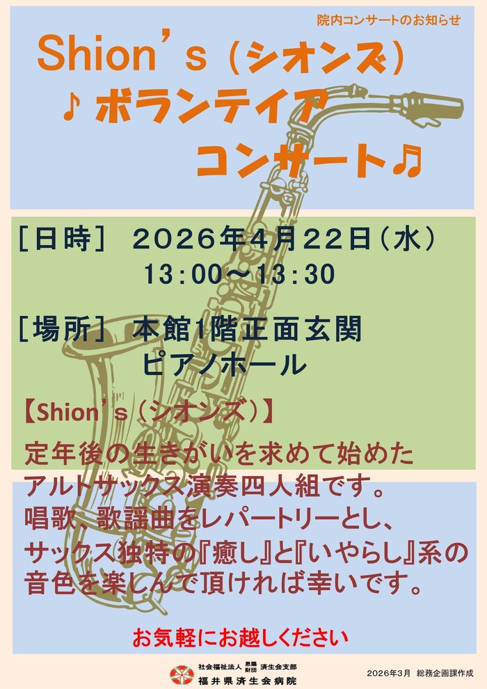 ボランティアコンサートを以下のとおり開催いたします。 ぜひお立ち寄りください。 日時 4月22日(水)13:00~13:30頃 場所 本館1階 正面玄関ピアノホール 演奏 Shio’s(シオンズ)