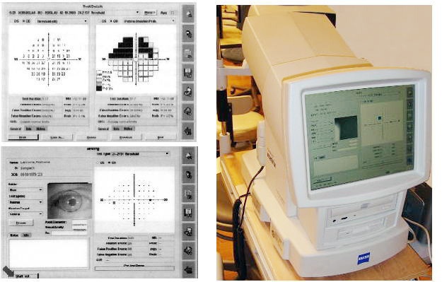 ハンフリーマトリックスとは緑内障の症状である視野欠損を早期に発見できる最新の視野検査機器です。緑内障は早期発見が大事ですが、通常の視野検査機器では、ある程度病状が進行しないと視野欠損を検出する事ができませんでした。しかしこのハンフリーマトリックスでは、特殊な縞模様を見ることで視野欠損を早期に発見する事が可能となりました。検査時間も片眼約5分程度と短く、患者さんの負担も軽減されています。