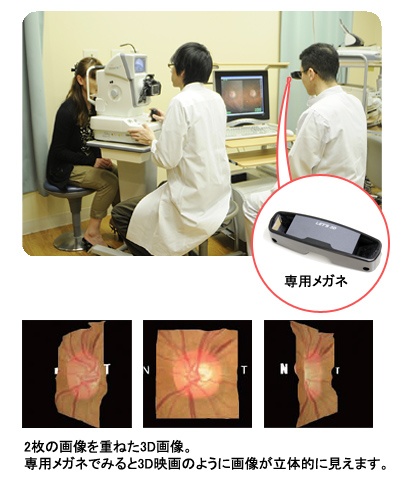 視神経乳頭を立体的に撮影し解析できる眼底カメラです。定期的に撮影することで形状変化を捉えることができるので、視神経乳頭に陥凹が起きる緑内障の経過観察に非常に有用です。